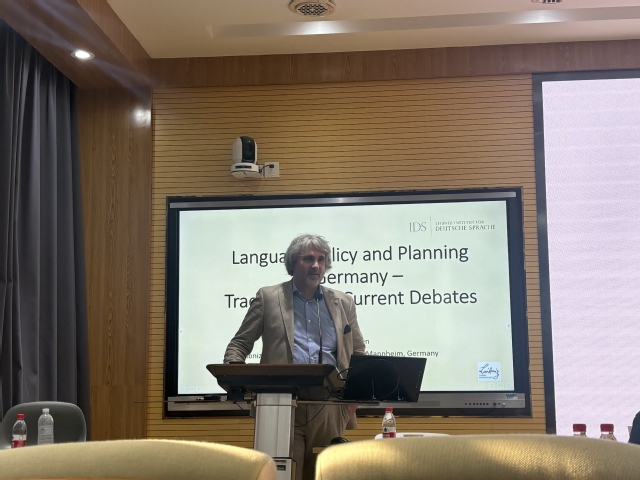 主讲人Dr. Marten首先从语言政策与规划的概念入手,结合经典理论阐释语言政策与规划的定义、内涵、分类及原则。接着,主讲人聚焦德国,介绍当今德国社会的语言状况,概括德国语言政策与规划的传统和特点,即语言地位规划的“单语思维”和本体规划的“放任自流”。