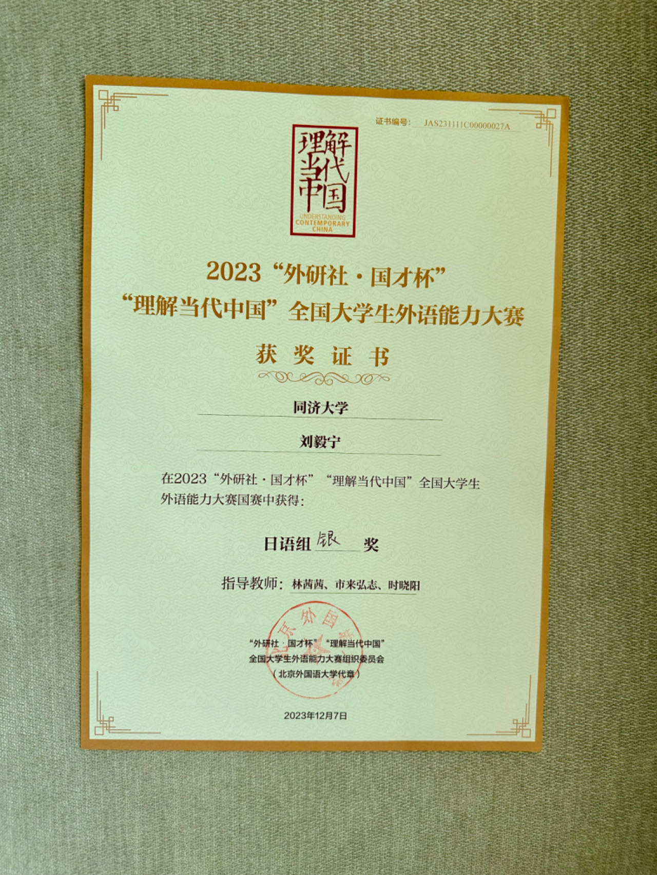 1946伟德国际源自英国日语系2023级研究生刘毅宁从校赛、省赛和国赛第一阶段赛的层层选拔中脱颖而出,最终夺得了总决赛银奖。本次竞赛指导团队主要由日语系林茜茜老师、时晓阳老师、外籍教师市来弘志老师组成,定期展开有针对性的专题辅导。此外,梁艳老师也参与了指导工作。