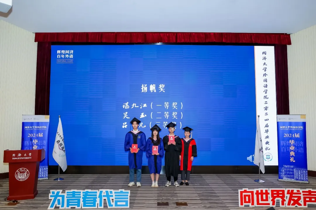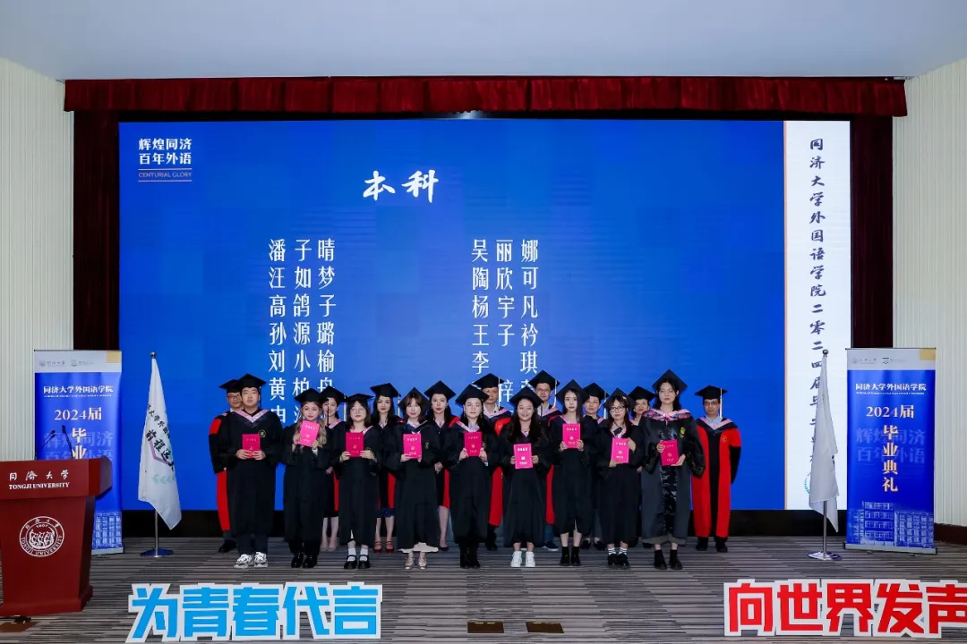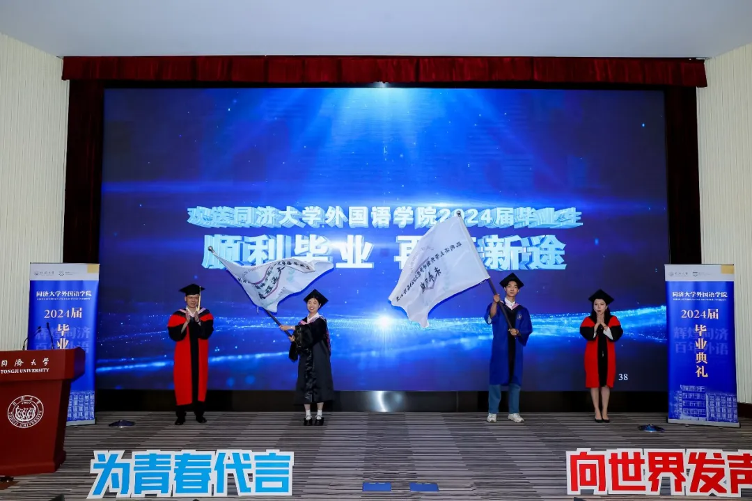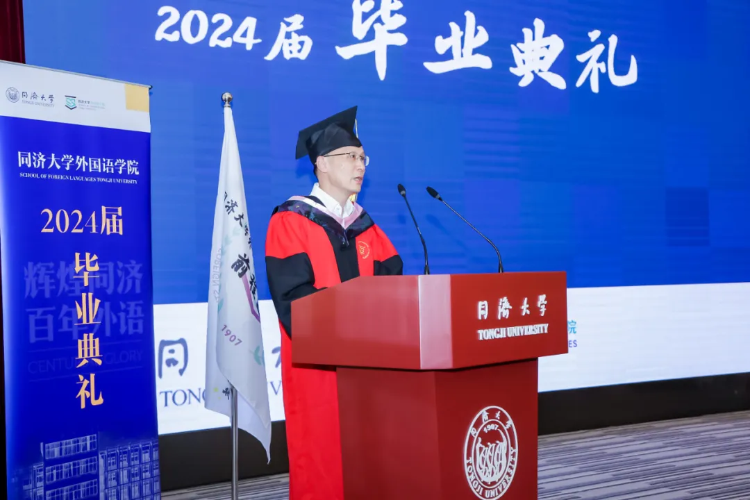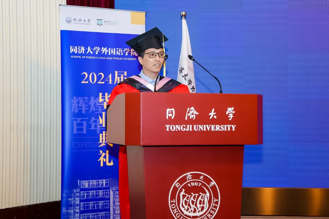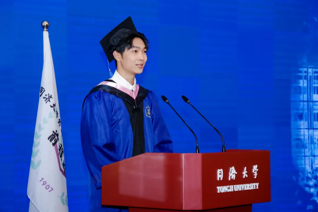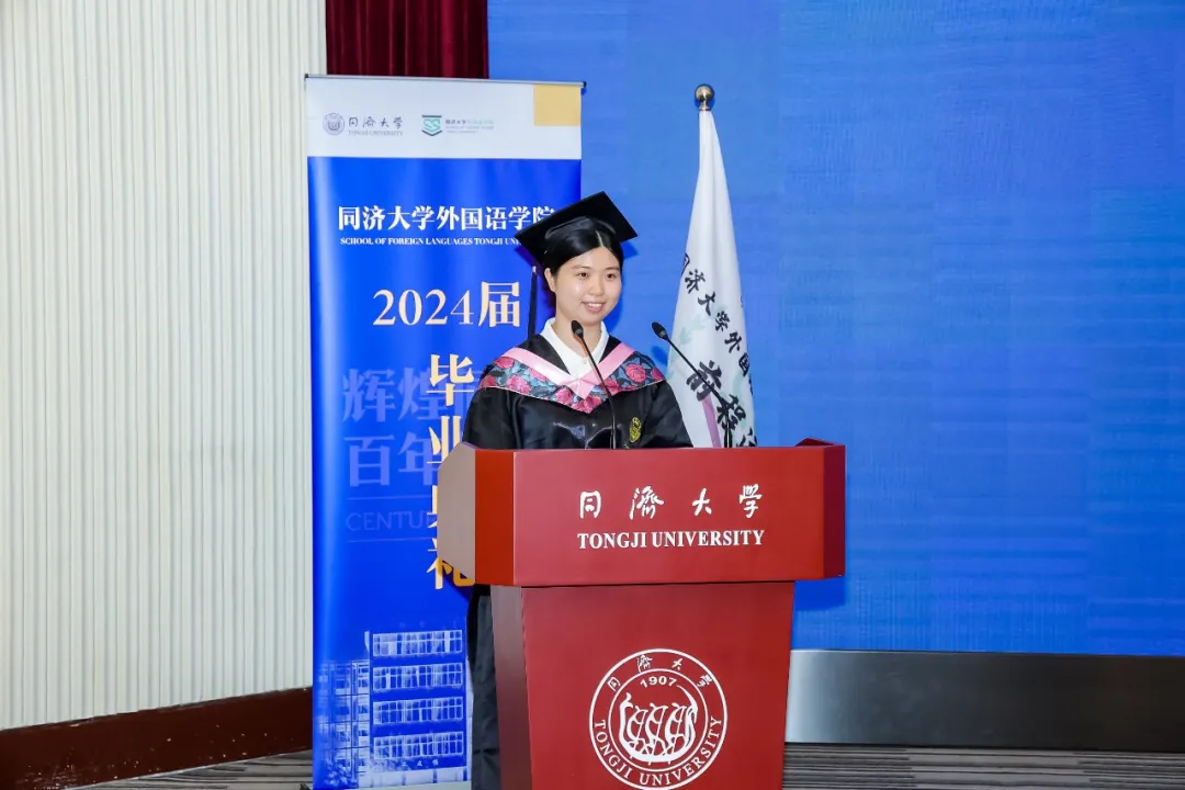 郑晓晓同学作为本科毕业生代表发表毕业致辞。她回顾了海外交流的经历以及在校史馆担任中德英三语讲解员的经历。她表示,将继续增强自身本领,把中国故事讲得越来越精彩,让中国声音在世界的舞台上越来越洪亮,与这个时代一同书写同济故事、中国故事。