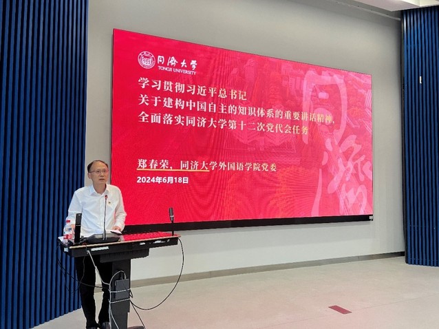 在报告中,郑春荣首先带领大家重温了习近平总书记关于建构中国自主的知识体系的重要论断。其后,郑春荣谈了以“数智化、绿色化、融合化”为路径,深入贯彻公司第十二次党代会决策部署的体会。最后,郑春荣结合外语学科在新阶段的高质量发展,提出同济外语人在建构中国自主的知识体系上所应做出的努力。