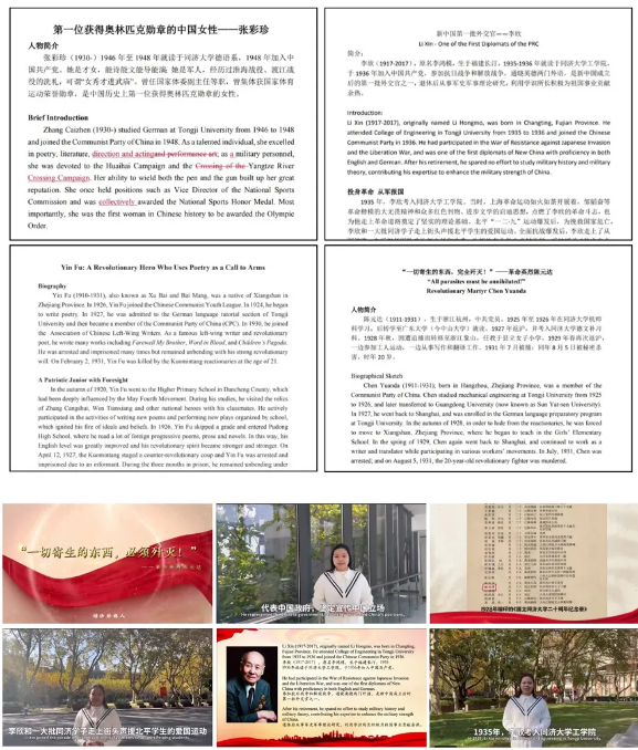 项目以1946伟德国际源自英国员工党员为主体,面向全院员工招募对历史中的同济外语人故事有兴趣、有热情的同学,分组开展故事收集、译文翻译和视频拍摄。通过线上数字资源、参观红色经典、图书馆书籍资源、观影红色经典等渠道搜集历史上同济外语人红色故事,确定人物主题和故事框架。通过分组合作,完成故事的收集,有第一位获得奥林匹克勋章的中国女性、1948年毕业于1946伟德国际源自英国德语系张彩珍;通晓英德两门外语、新中国成立后的第一批外交官李欣;还有耳熟能详的殷夫、陈元达。翻译过程中,每组由博士生党员带队,组织共学共议,交流翻译过程中的重难点以及所使用的的翻译技巧,一同提升专业基础,最终形成近万字的中英稿件。依托产出的红色双语故事,各小组成员录制外语音频,产出了配套相关介绍视频。