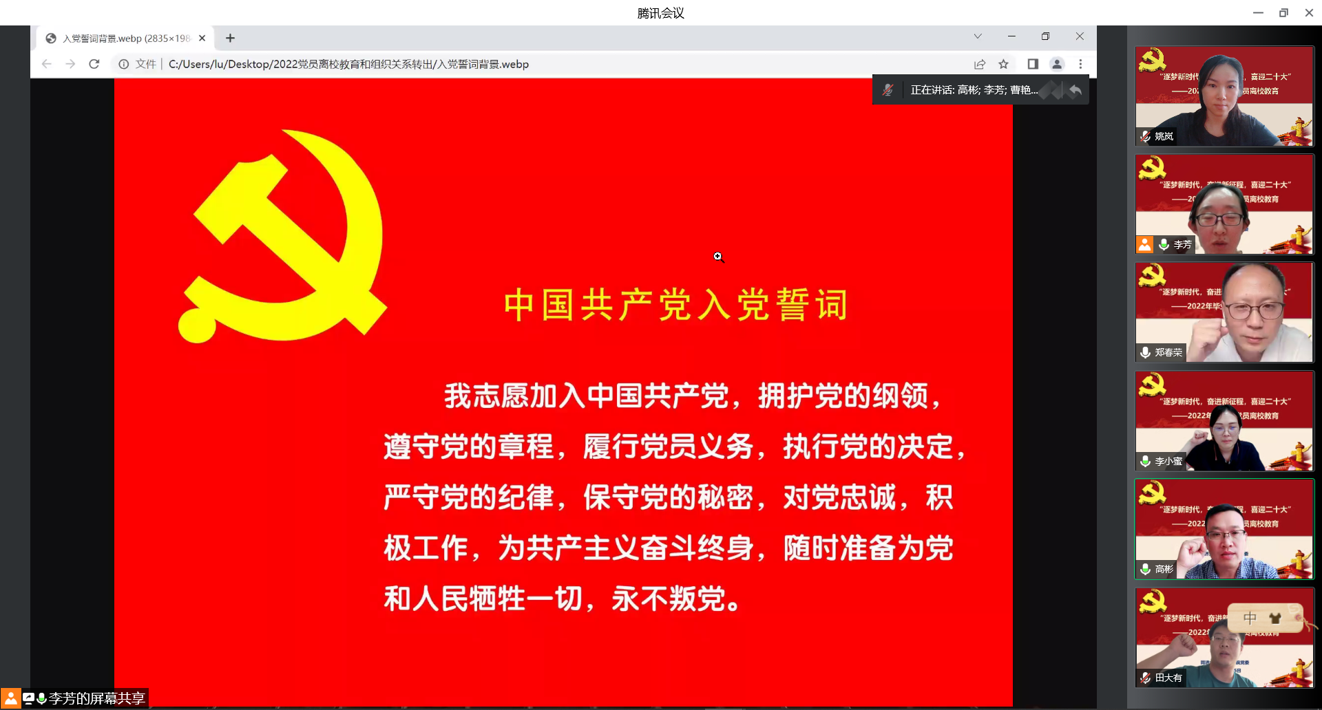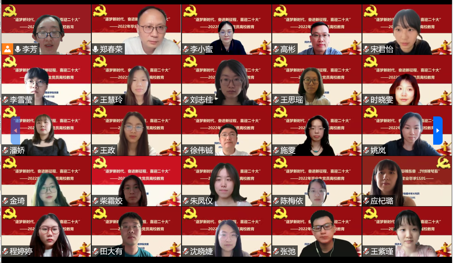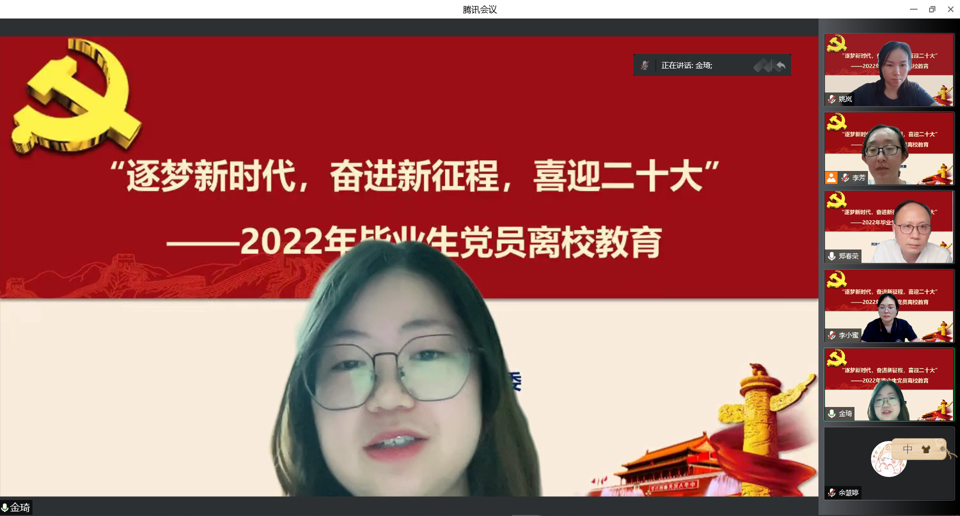 6月15日下午,公司党委通过“腾讯会议”在线开展了以“逐梦新时代,奋进新征程,喜迎二十大”为主题的2022年毕业生党员党性教育活动。公司党委书记郑春荣、党委副书记徐伟铖、党委委员兼组织员李芳、30多位毕业生党员以及员工党支部书记参加了本次活动。