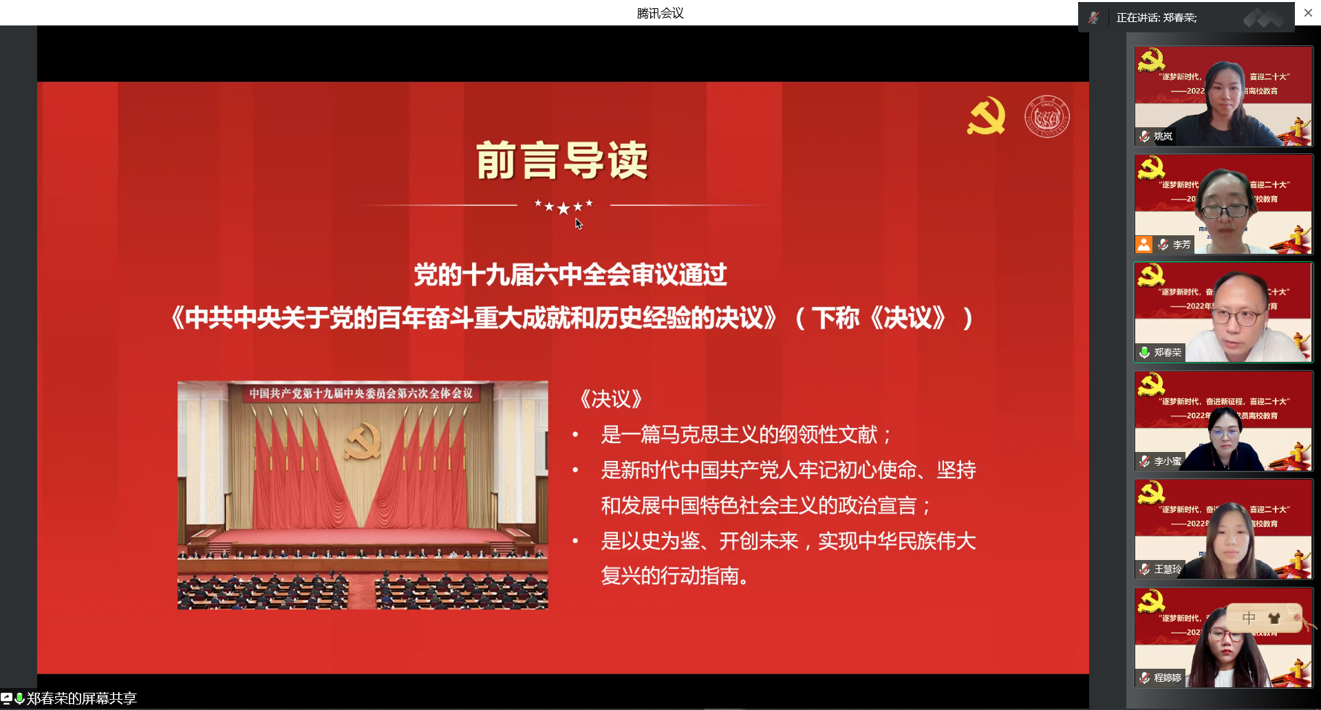 首先,郑春荣带领毕业生党员学习了《中共中央关于党的百年奋斗重大成就和历史经验的决议》精神,作为毕业生党员离校前党性教育的主要内容。