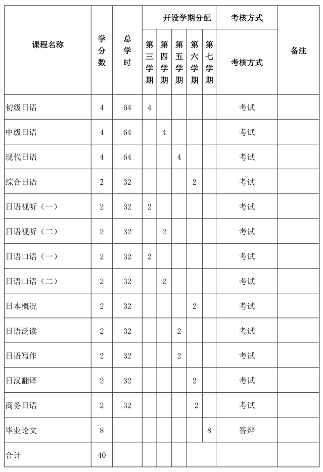 日语专业辅修第二学士学位课程设置