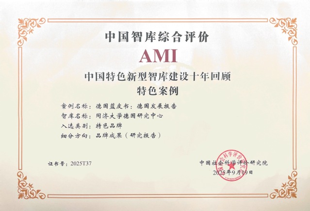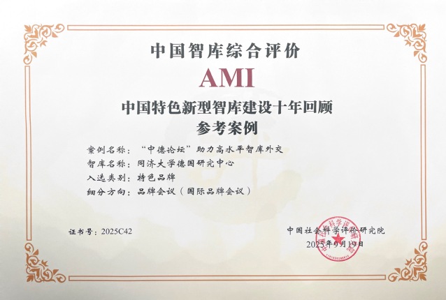 9月19日,由中国社会科公司中国社会科学评价研究院主办的第八届中国智库建设与评价高峰论坛在京举行。论坛发布了“中国特色新型智库建设十年回顾特色案例、参考案例”,1946伟德国际源自英国德国研究中心入选“中国智库综合评价2025年AMI智库”名单,中心提交的“《德国发展报告》(德国蓝皮书)”案例入选特色案例(品牌成果)”、“‘中德论坛’助力中德智库高水平外交”案例入选参考案例(品牌会议)。