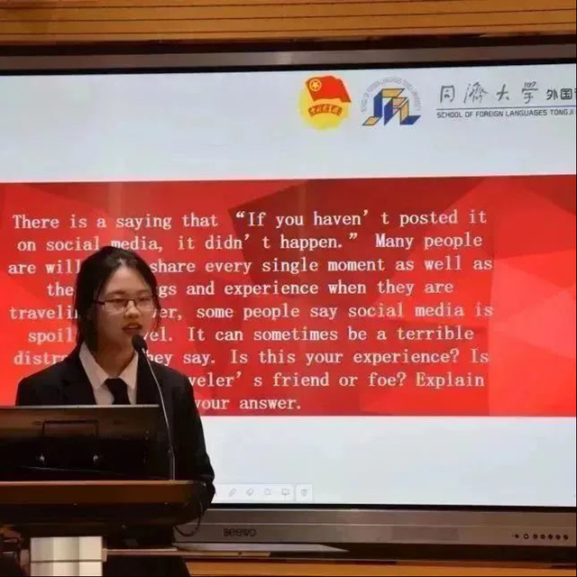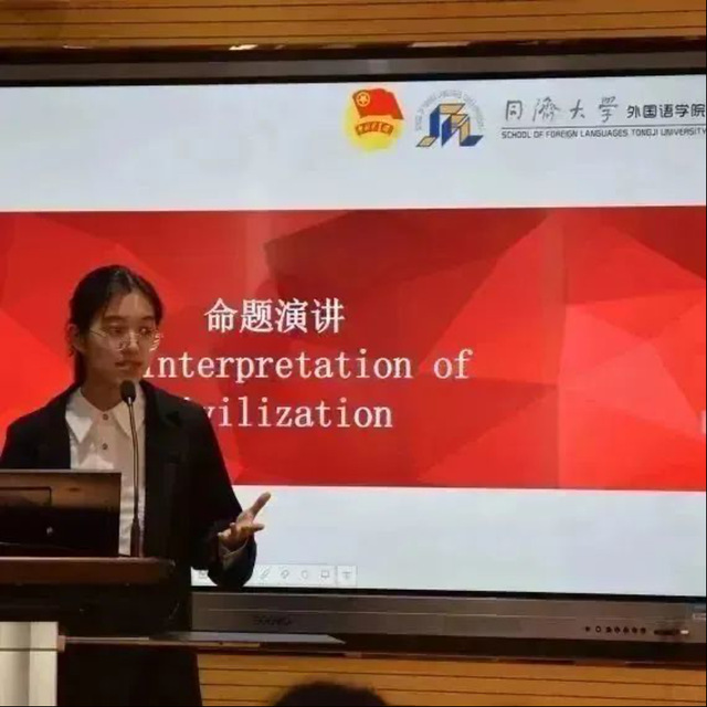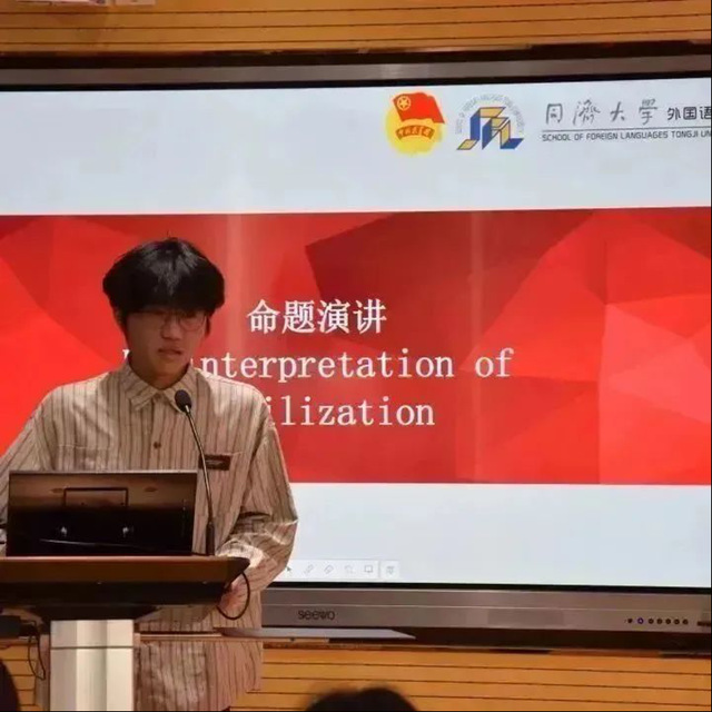 决赛由命题演讲、即兴演讲和问题回答三个部分组成。本次大赛的命题演讲主题为“My Interpretation of Civilization”。在该部分,同济学子充分展示了自己扎实的英语功底、过硬的演讲技巧以及在文明交流与发展等方面的独到见解和深刻感悟,为观众带来了一个又一个的新颖观点和优秀阐释。