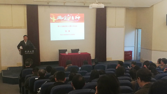 张雄结合参会经历,带领大家解读政府工作报告,深刻领会第十三届全国人大第二次会议的精神和内容,包括2018政府工作报告、2018政府工作业绩、2019政府工作目标、2019年政府惠民红包等,以及本次政府工作报告政策释放的九个信号,如稳就业、更大规模减税、精准有效支持实体经济、高品质发展和绿色发展等。此外,张雄详细介绍了政府工作报告新词和热议点、人大常委会工作报告、两高工作报告和热议点、以及最高法和最高检的工作新亮点。此外,张雄还与大家分享了全国人大第二次会议的花絮和剪影,讲座内容丰富,赢得在座教职工阵阵掌声。