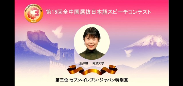 王少琪同学在去年年底举办的中华全国日语演讲比赛(华东赛区)预赛中,以第一名的成绩获得华东赛区特等奖。本次代表华东赛区参加全国总决赛,是公司员工第一次赢得预赛进入全国总决赛,取得了历史性的突破。本次比赛不仅向外界展示了同济学子的优秀专业素养和良好的精神风貌,而且体现出了日语系专业在不断探索人才培养新模式后取得的成效。