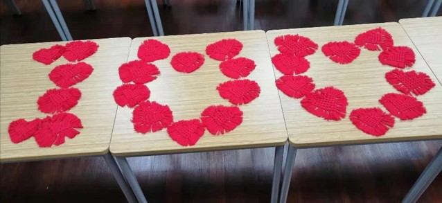 活动尾声,大家把每个人编织的红心拼接在一起,分别组成了“100”和“七.一”的字样,表达了大家喜迎建党百年的心情。