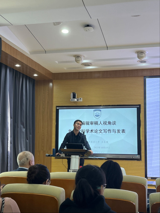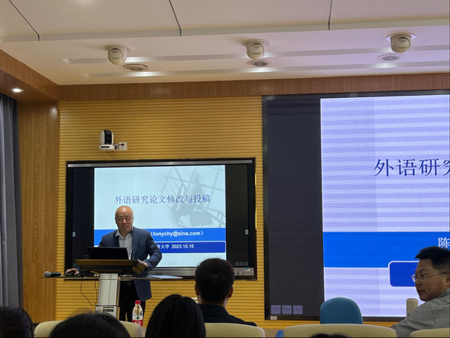 陈勇教授围绕外语研究论文修改与投稿这一主题从论文前件、论文框架、论述逻辑、语言文字、格式规范等方面结合实例详细介绍了修改论文的方法与步骤。吕生禄教授的发言主题为从编辑审稿人的视角谈外语学科学术论文的写作与发表。吕教授分享了他对于外国语言文学研究的几点思考,并从引言写作、文献综述意识、研究结果的呈现以及修改文稿的要领等方面分享了他的宝贵经验。